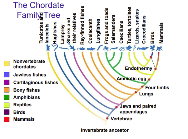 Evolution of chordates showing the sea-squirt (Tunicates) as the ancestor of the vertibrates.7.
