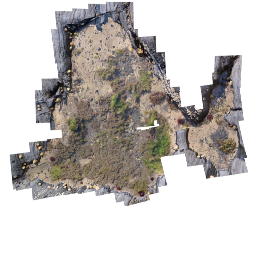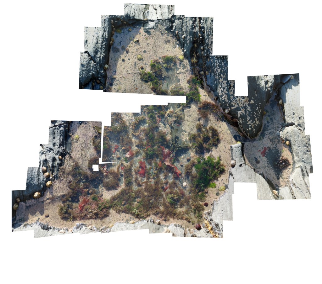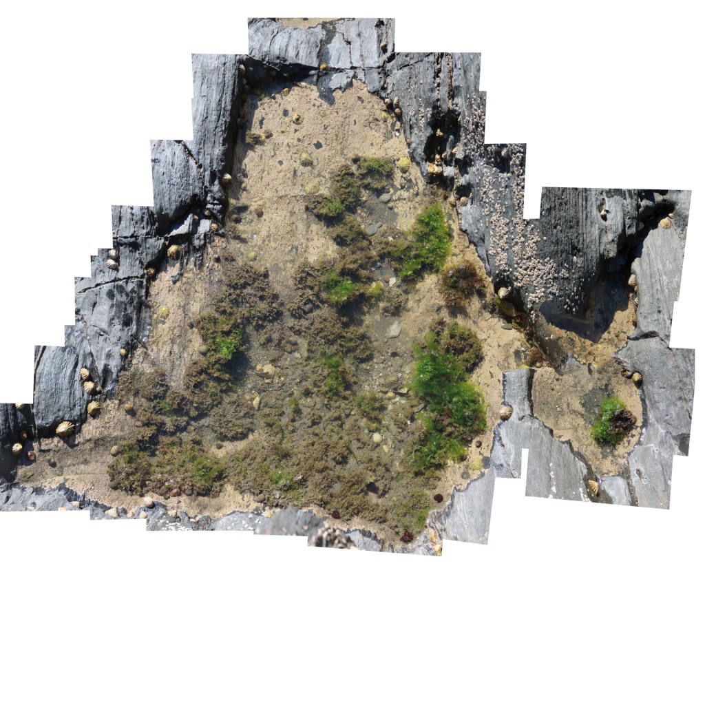 Photo-mosaics are used to record the rockpool at the time of each survey. The variety and abundance data were obtained using these photo-mosaic images rather than directly in the field (this is an experimental approach). The complete high resolution photo-mosaics can be viewed by clicking on the individual images in ‘Monthly photo-mosaics’ section below. (Further examples illustrating this technique are available on this website here. )