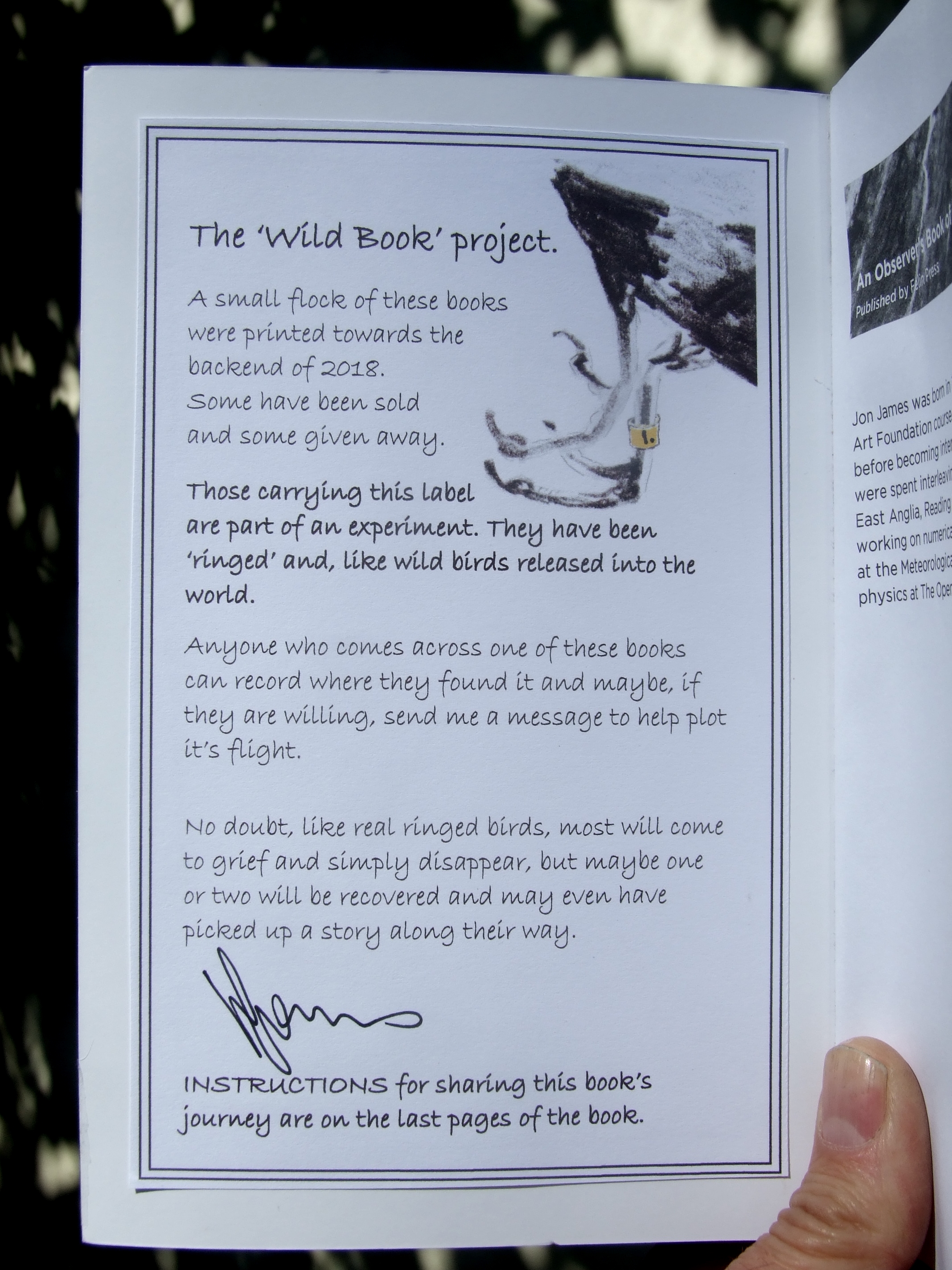 I have heard both authors and musicians describe the action of sending a finished piece of work out into the public arena as ‘releasing it into the wild’. If, as in this case, the finished piece of work happens to be a bird book the idea naturally follows to release the book as if it were a wild bird, i.e. ring it and let it go. This, whimsical idea led to the ‘Wild Book Project’ in which a number of copies of ‘An Observers Book of Birds’ ( https://jonjamesart.com/books/an-observers-book-of-birds/ ) were numbered (ringed) and either given to people with instruction to read and pass it on, or left in public places. Contact details were provided so that anyone finding one of the books could let me know so that its flight could be recorded.